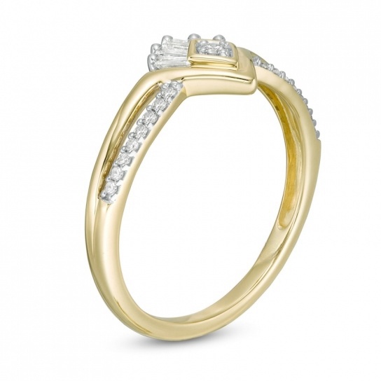 Crafted in warm 10K gold, this princess-perfect piece features a brilliant diamond in a kite-shaped frame and topped with a row of baguette-cut diamonds – all set in a “V”-shaped center. The double-row split-prong setting gleams with a polished and diamond-rimmed ribbon, completing the tiara-like look. This ring features a 1/5 carat diamond that is polished to a dazzling shine.