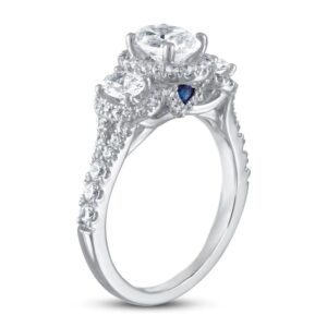 This spectacular three-stone engagement ring features dazzling oval diamonds haloed by round diamonds. Even more round diamonds add brilliance to the band, bringing the total diamond weight to 1 3/4 carats. Princess-cut sapphires, the signature of the collection and a symbol of faithfulness and everlasting love, are set into the ring bezel. The 14K white gold ring is a brilliant beginning to your romantic love story.