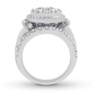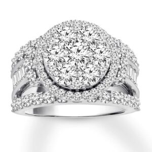 Imagine her surprise when she sees this unforgettable engagement ring. With a center arrayed in dazzling round diamonds, the ring is sure to capture attention. The band showcases a sparkling row of round diamonds at the top and bottom with a line of baguette diamonds in the center to complement. Styled in beautiful and versatile 14K white gold, the ring has a total diamond weight of 3 1/2 carats. Available online while supplies last. Previously Owned Treasures are not eligible for in-store pickup. Previously Owned Treasures may only be shipped either to your home address or to an alternate address.