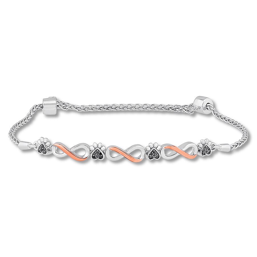 This fabulous bolo bracelet for her captures the eternal love for a pet with paw prints and infinity signs. Black diamonds accent the paw prints, and curves of 10K rose gold embellish the infinity signs for splashes of color. The sterling silver bracelet has a total diamond weight of 1/10 carat. The clasps slide along the wheat chain to adjust the bracelet up to 9.5 inches in length. Black diamonds are treated to permanently create the intense black color.