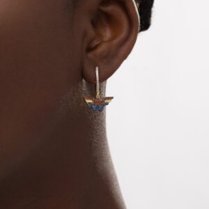 Express your epic style with these vibrant gemstone and diamond drop earrings. Crafted in warm 10K gold, each eye-catching drop features bright blue sapphires and regal garnets bringing color to the classic logo. Diamonds sparkle along the hoop above the dangle. Captivating with 1/15 ct. t.w. of diamonds and a brilliant buffed luster, these earrings secure with hinged backs. This exclusive fine jewelry collection inspires you to wear your strength, confidence and power.