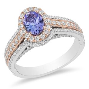 Drenched with vibrant colour, this gemstone and diamond engagement ring is an unforgettable look. Crafted in 14K two-toned gold, this bold design showcases a delectable 7.0 x 5.0mm oval-cut violet-blue tanzanite set in rose gold and wrapped in a sparkling diamond frame. A diamond-encrusted rose and white gold multi-row wrap-around the rose gold shell and white gold and diamond ribbons underneath. Small crown insets lower on the complete this magical choice. Sublime with 3/4 ct. t.w. of diamonds and a brilliant buffed luster, this engagement ring is a unique look of love.
