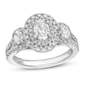 , this captivating 3-stone engagement ring showcases a trio of oval diamonds. Set beneath the bezel of the largest stone are two princess-cut sapphires, the signature of the collection and symbol of everlasting love. The polished band is lined with round accent diamonds on all sides, ensuring sparkle from any angle. Set in 14K white gold with a total diamond weight of 1 1/2 carats, this engagement ring is a brilliant beginning to your romantic love story.